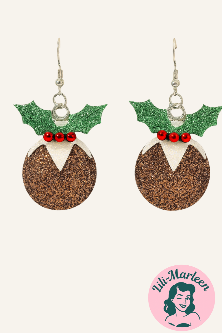Giv dit outfit et humoristisk og hyggeligt præg med disse sjove hængeøreringe formet som julepuddinger. Med brunt glimmer, grønne kristtornblade og små røde bær får du et charmerende og anderledes julelook. Perfekte til julefrokost, juleaften eller som gave til hende, der elsker unikke accessories med masser af julestemning.