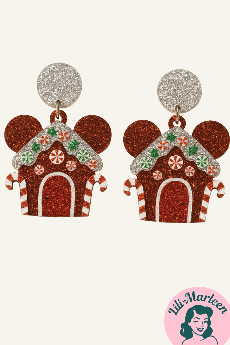 Tilføj et legende og hyggeligt præg til dit december-look med disse hængeøreringe formet som små honningkagehuse. De er dekoreret med rød og sølv glimmer, stribede slikstokke og farverige detaljer, der giver et sjovt og iøjnefaldende udtryk. Perfekte til julefrokost, juleaften eller som gave til hende, der elsker accessories inspireret af julens søde sager.