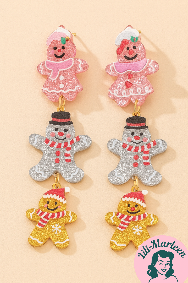 Lange Øreringe – Honningkagemænd i Julens Farver - Sjove og festlige juleøreringe: Tilføj et strejf af julens sødme med disse lange ørehængere, der er pyntet med glitrende honningkagemænd i forskellige farver. Hver ørering består af tre charmerende figurer med julehuer, tørklæder og glimmer – perfekte til at skabe et festligt blikfang.