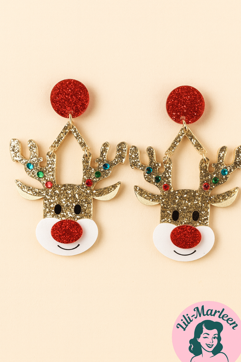 Øreringe – Rudolf med Glitrende Gevir og Rød Næse - Festlige juleøreringe med masser af glimmer: Disse sjove og iøjnefaldende juleøreringe forestiller Rudolf med sin klassiske røde næse og glitrende gevir pyntet med små farvede detaljer. Et smykke, der straks spreder juleglæde og får dit outfit til at funkle til julefrokosten eller familiens julehygge.