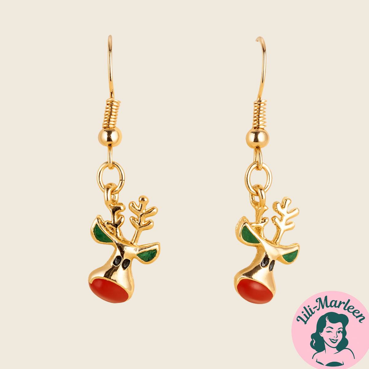 Øreringene måler cirka 1,2 x 1 cm og er fremstillet i let legeret metal med farvede emaljedetaljer i rød og grøn. Den klassiske krog-lukning gør dem behagelige at bære, mens det elegante design giver et festligt, men stadig stilrent udtryk.