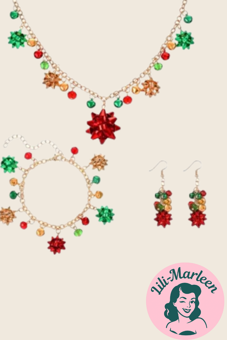 Sættet består af halskæde, armbånd og øreringe. Smykkerne er fremstillet i legeret metal uden skadelige stoffer. Halskæden og armbåndet har justerbare kæder, så de passer til forskellige størrelser. Kombinationen af klare farver og legende detaljer gør smykkerne oplagte til julefrokoster, juleaften eller som en sjov gaveidé.