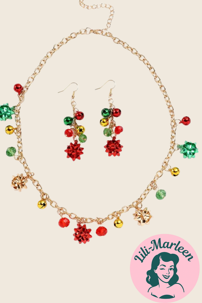 Skab ægte julestemning med dette festlige smykkesæt, der kombinerer klassiske julefarver med legende detaljer. Halskæden er pyntet med små rosetter og julekugler i rød, grøn og guld, afsluttet med en stor rød gavebånds-roset som blikfang. Øreringene matcher med en enkel og elegant roset, der giver sættet et stilfuldt helhedsudtryk.