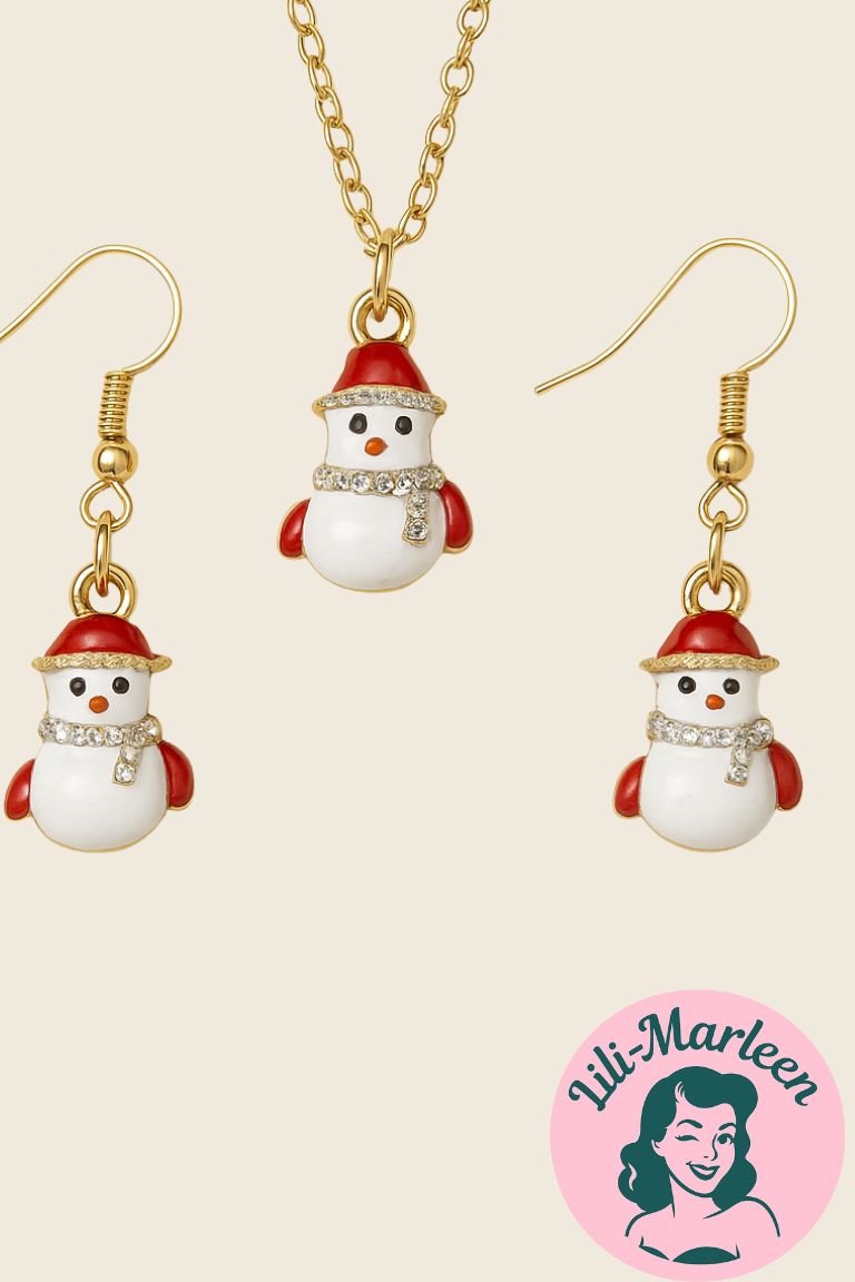 Sættet består af en halskæde med snemandsvedhæng samt matchende øreringe. Smykkerne er fremstillet i legeret metal uden skadelige stoffer og pyntet med emalje og små glitrende sten, der fanger lyset. Halskæden har justerbar længde, så den passer til enhver anledning.