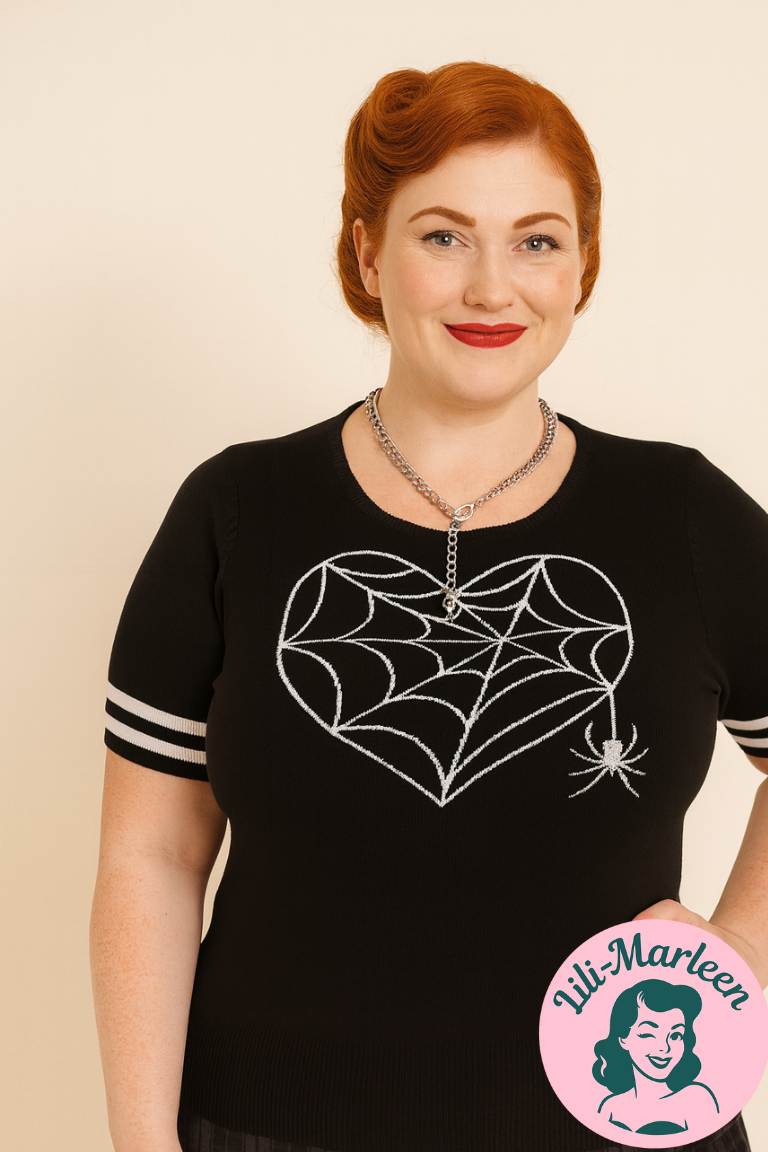 En strik med charme og kant! Pias Jumper fra Hell Bunny er en sød sort strikbluse med et hjerteformet edderkoppespind og lille edderkop – perfekt til dig, der elsker, når der er gjort noget særligt ud af detaljerne.