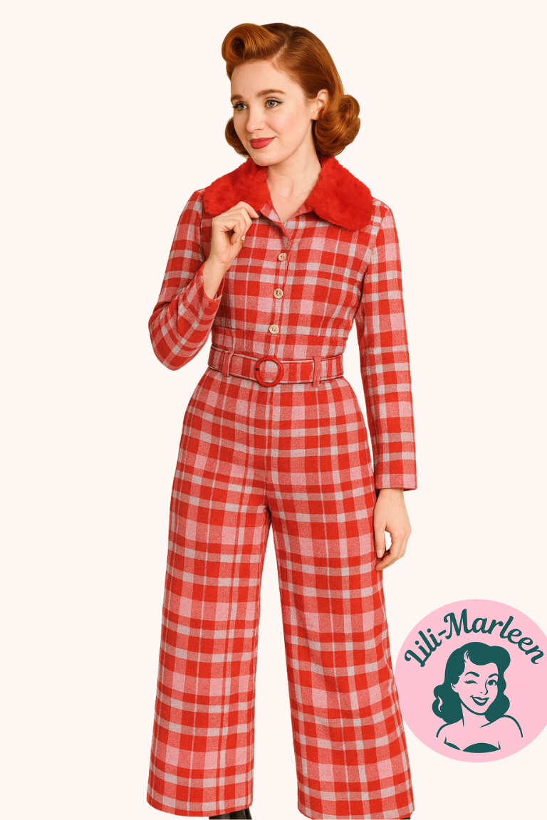 Embracér ægte 60/70'er vibe med denne fantastiske buksedragt! De skønne farver i rød/lyserød tern med teal og karrygul giver en smadder fræk og iøjnefaldende stil.