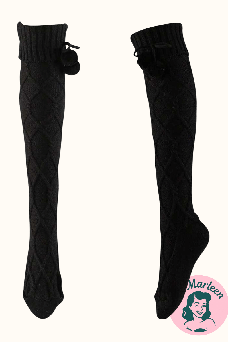 Knæsokker – Sorte Hyggesokker i Tyk Strik med Kvaster – Klassiske, varme og lidt frække