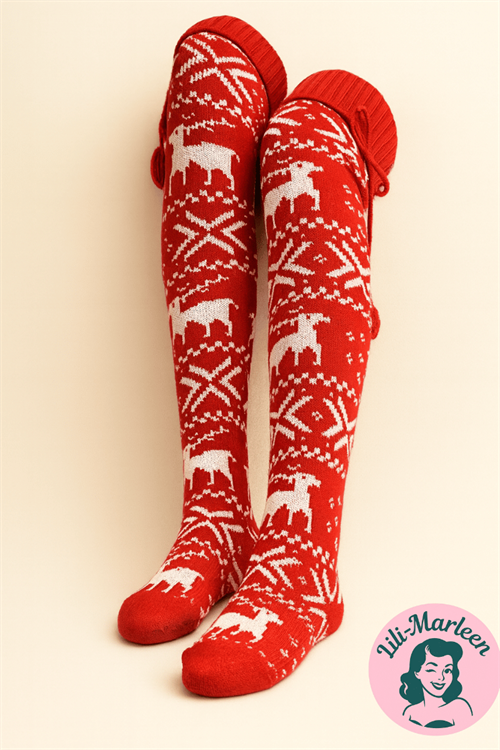 Knælange Strikstrømper – Rensdyr & Nordisk Jul i Rød