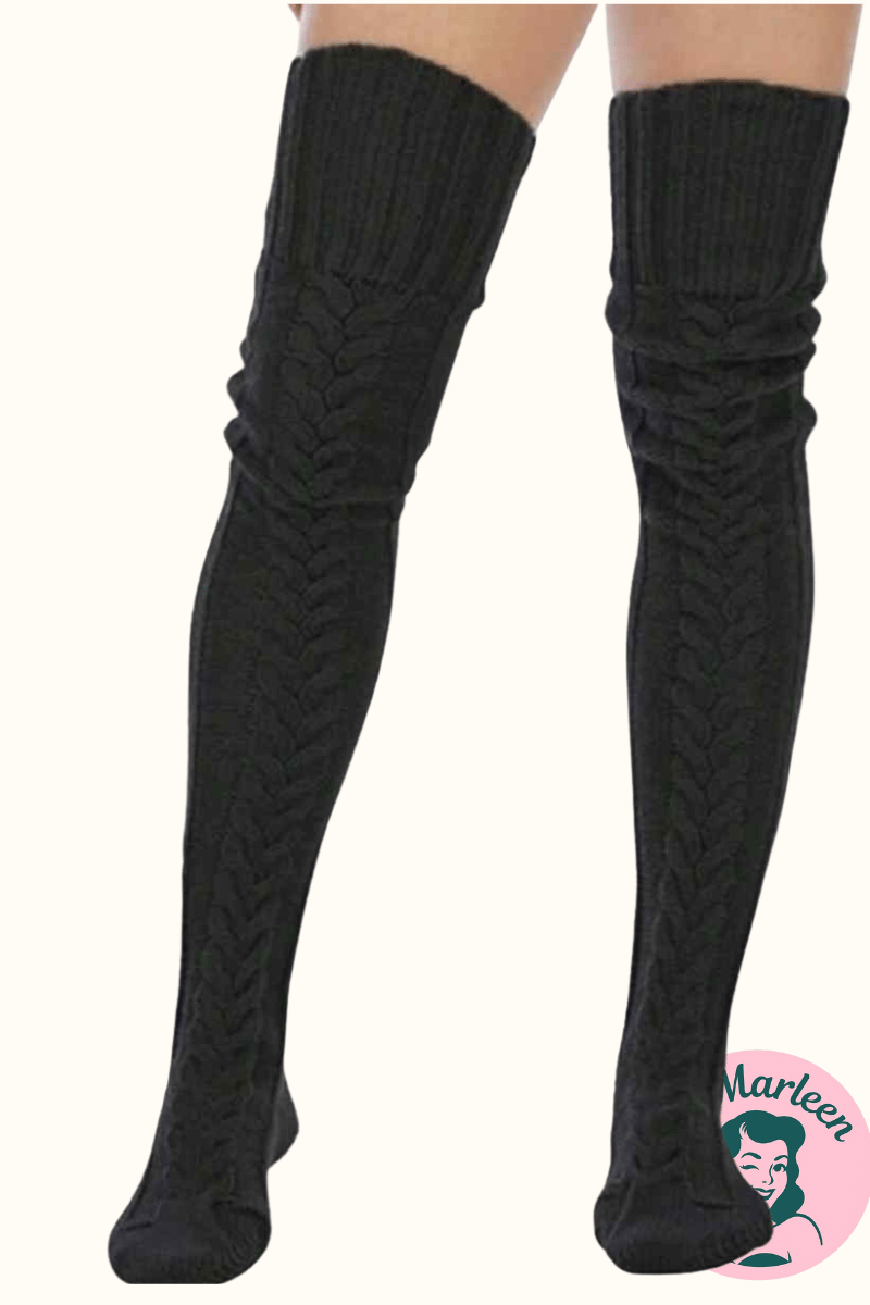 Knæsokker/hyggesokker - Lange - Lun sorte knæsokker i tyk strik- ekstra lange Disse feminine og lune knæsokker er det perfekte tilbehør til vinteren – både som hyggesokker til hjemmehygge og som en elegant detalje under julekjolen. De er lige dele varme, stilfulde og en smule frække.