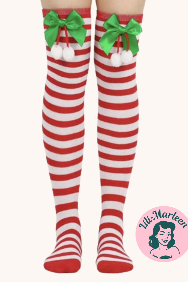 Disse festlige strømper er det ultimative juleaccessory! Med røde og hvide striber, grønne satin-sløjfer og små hvide kvaster får du det perfekte "Candy Cane"-look. De er dejlig tykke og varme, så de både kan bruges til julefrokosten, nissedragten eller bare til at sprede julehygge derhjemme.