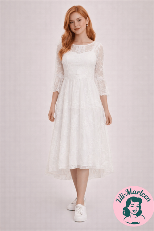 Den smukke Evy konfirmationskjole er en halvlang bohemeinspireret kjole med delikate blonder, der bringer elegance og en let romantisk stemning til din store dag. Den offwhite nuance og de fine detaljer gør den ideel til konfirmation eller andre festlige begivenheder.