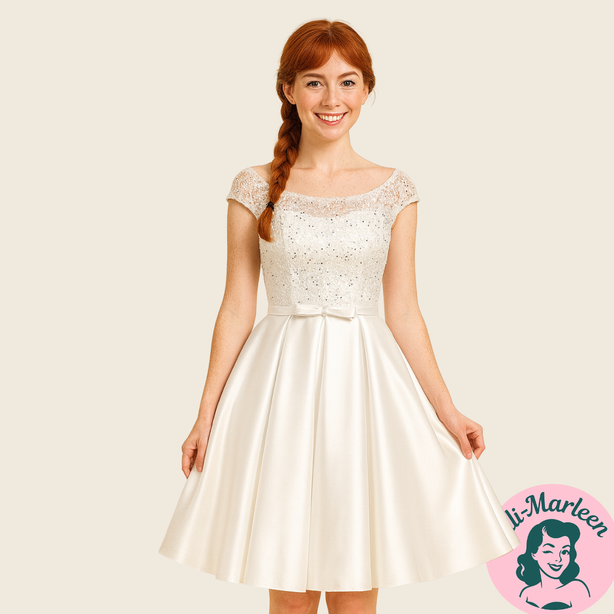 Føl dig som en stjerne på din store dag med Julianna, en smuk konfirmationskjole i kraftig satin. Med snørre i ryggen og palietter på overdelen får du en kombination af enkel elegance og glitrende detaljer, der gør dig til dagens midtpunkt.