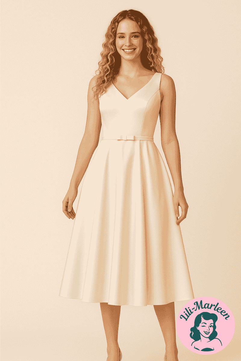 Føl dig som en stjerne med Mathilde, en halvlang kjole i kraftig satin med en smuk korsageryg. Den tidløse cremefarve og det elegante design gør den ideel som både konfirmationskjole og kort brudekjole.