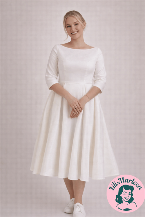 Saga My – En elegant hvid konfirmationskjole i satin Gør din store dag endnu mere speciel med Saga My, en klassisk hvid konfirmationskjole i kraftig satin. Kjolens vintage-inspirerede snit med bådudskæring, høj hals og lavere ryg giver et tidløst og sofistikeret udtryk. Perfekt som konfirmationskjole eller som en kort brudekjole.