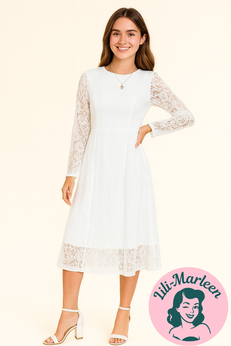 Drømmer du om en enkel og romantisk konfirmationskjole? "Wissye" er skabt til dig, der ønsker en klassisk hvid kjole prydet med fine vintageblonder. Med sit feminine og tidløse udtryk er den perfekt til din store dag, hvor komfort og elegance går hånd i hånd. Kjolen har lange blondeærmer og diskret lynlås i ryggen, så du kan føle dig både smuk og tilpas hele dagen.