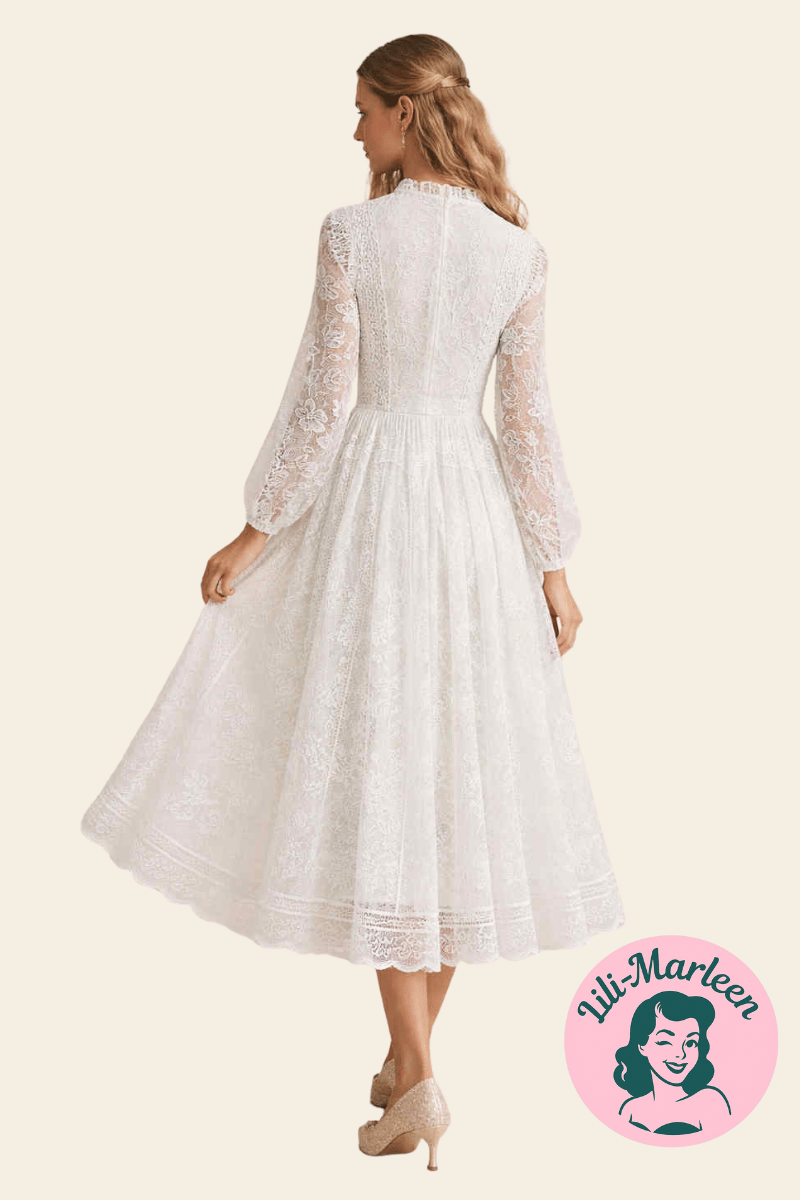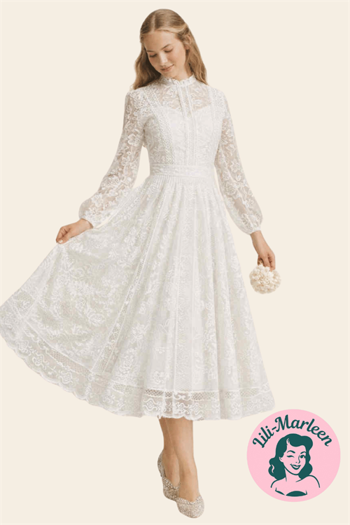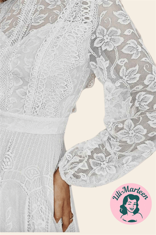 Kjolen er udført i fine, gennemgående blonder med et let transparent udtryk i ærmer og overdel. Den høje hals og de lange ballonærmer giver et elegant, næsten poetisk præg, mens den markerede talje og det lange, svajende skørt skaber en smuk silhuet. Skørtet falder blødt og naturligt og giver kjolen bevægelse og luft – perfekt til en lang dag med både ceremoni og fest.