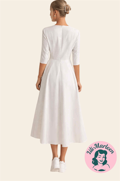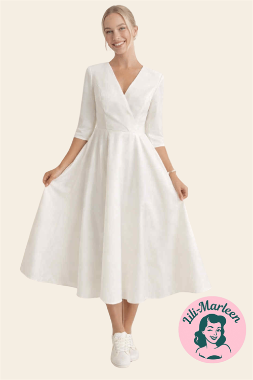 Kjolen er syet i kraftig satin med en glat overflade og let struktur, som giver kjolen tyngde og en eksklusiv fornemmelse. Stoffet falder flot uden at klistre og holder faconen hele dagen.