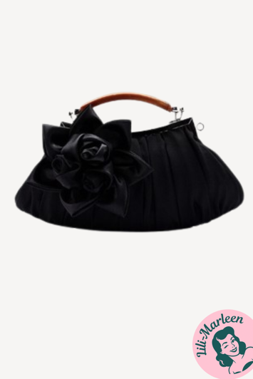 En elegant og feminin cocktailtaske i sort satin, prydet med en smuk rose på fronten og et lille håndtag, der giver et klassisk og romantisk udtryk. Konval er perfekt til dig, der ønsker en taske, som både er praktisk og fuld af charme – ideel til at matche dine yndlingskjoler og festlige sko.