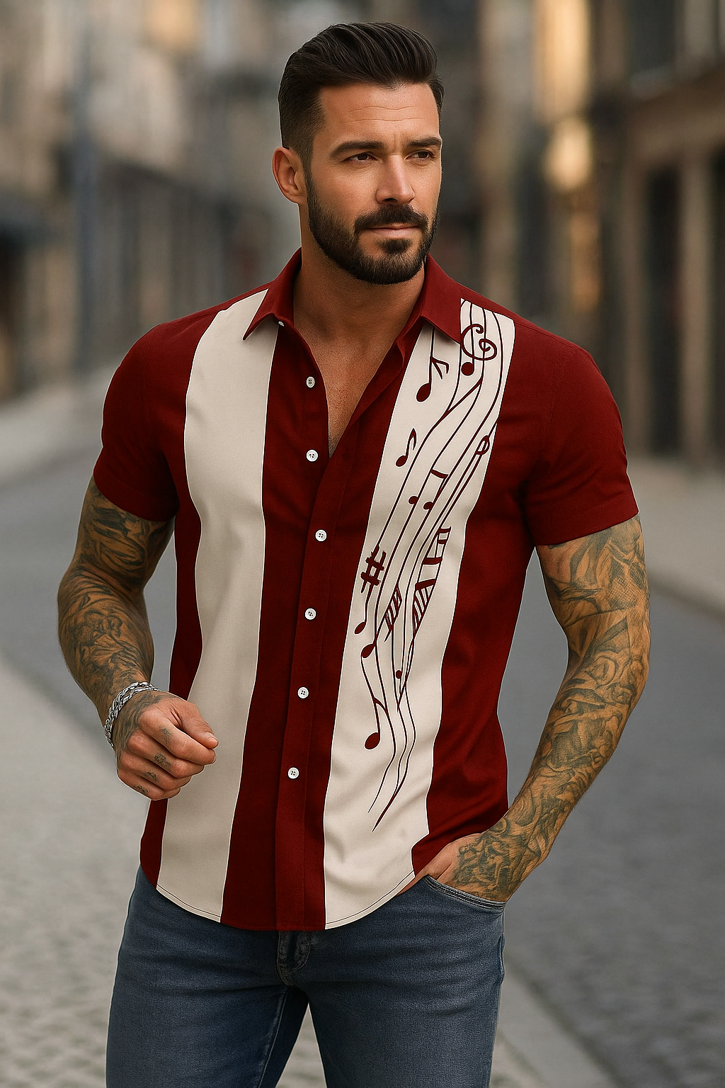 For ham, der ikke bare spiller på følelser – men også på stil. Skjorten er til manden, der tør bære rytme på kroppen og vise, at stil kan være både rebelsk og elegant. Med røde toner og hvide striber snor noderne sig over brystet som en hyldest til Miss Brains egen soundtrack – et liv fyldt med kærlighed, kaos og kant.