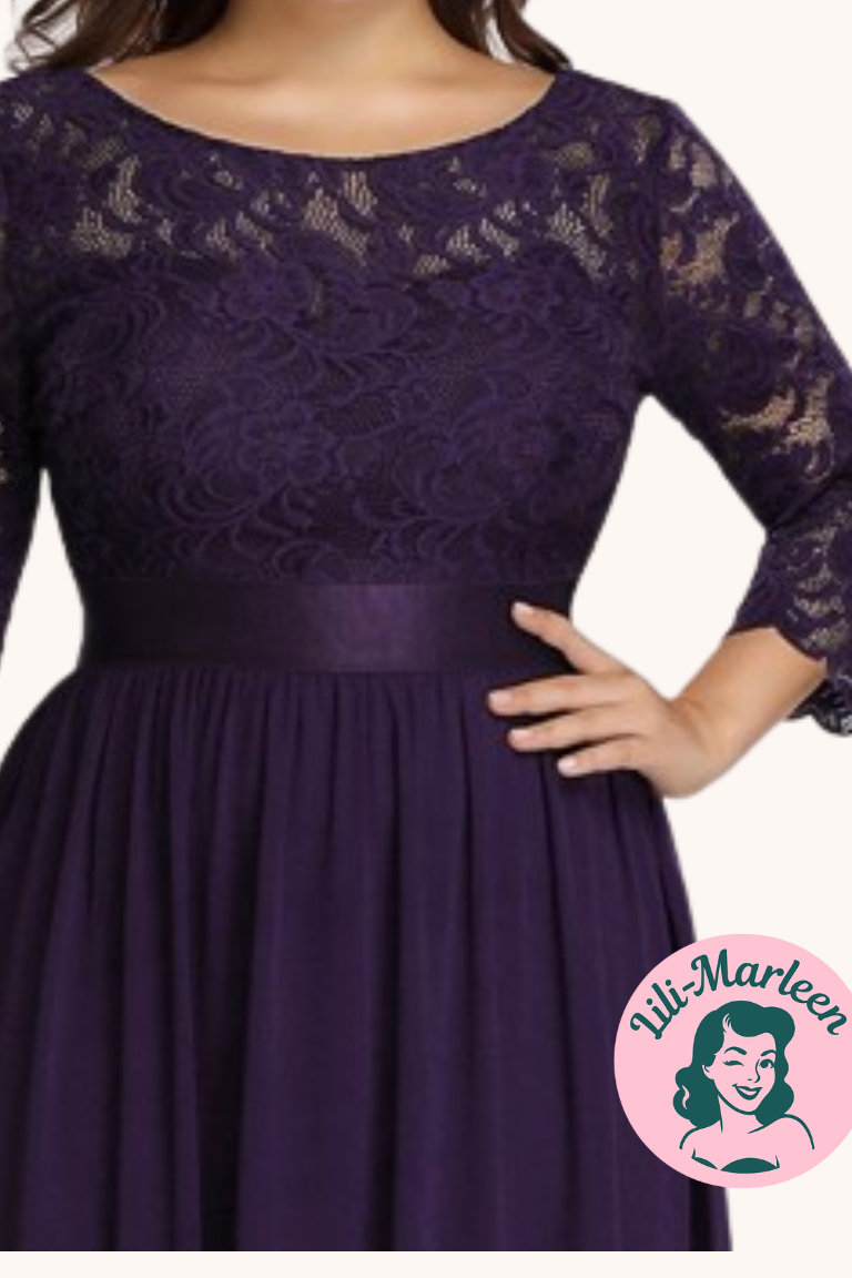 Agnete – Smuk lang lilla gallakjole med blondeærmer