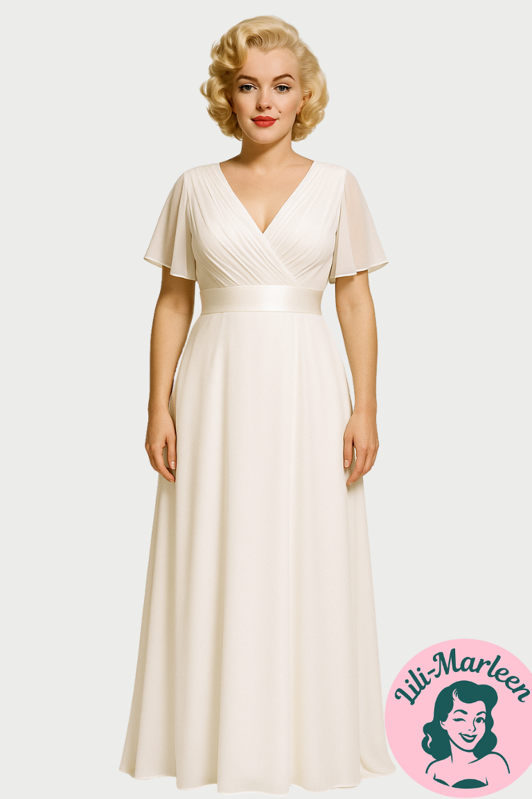 Gør dig klar til at stråle i vores smukke Cornelia-kjole! Denne tidløse klassiker med underkjole og chiffonlag, sommerfugleærmer, elegant v-udskæring og satinbånd i livet er skabt til at fremhæve din naturlige skønhed. Særligt velegnet til kvinder med en større barm, giver denne kjole et flatterende og stilfuldt look, der passer til enhver festlig lejlighed – fra galla til bryllup.