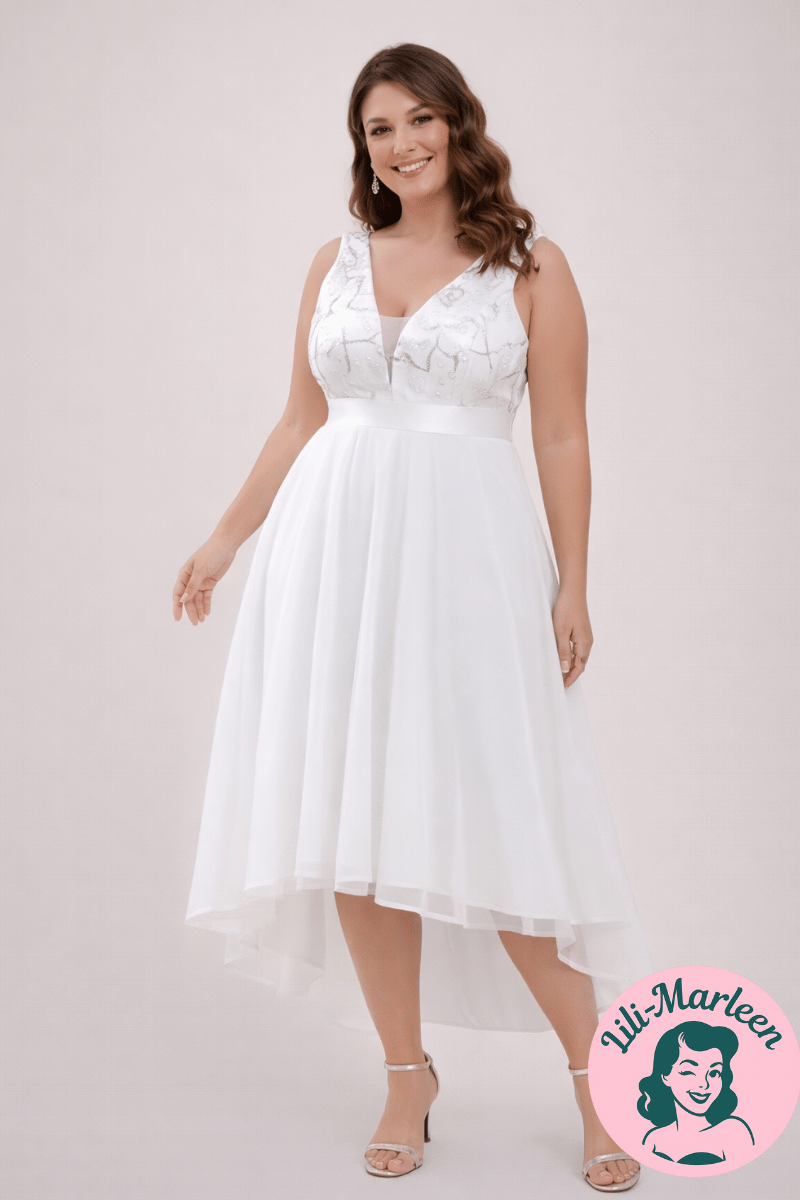 Bryllupskjole/Gallakjole/Konfirmationskjole – Hvid med high/low skørt og sølvdetaljer