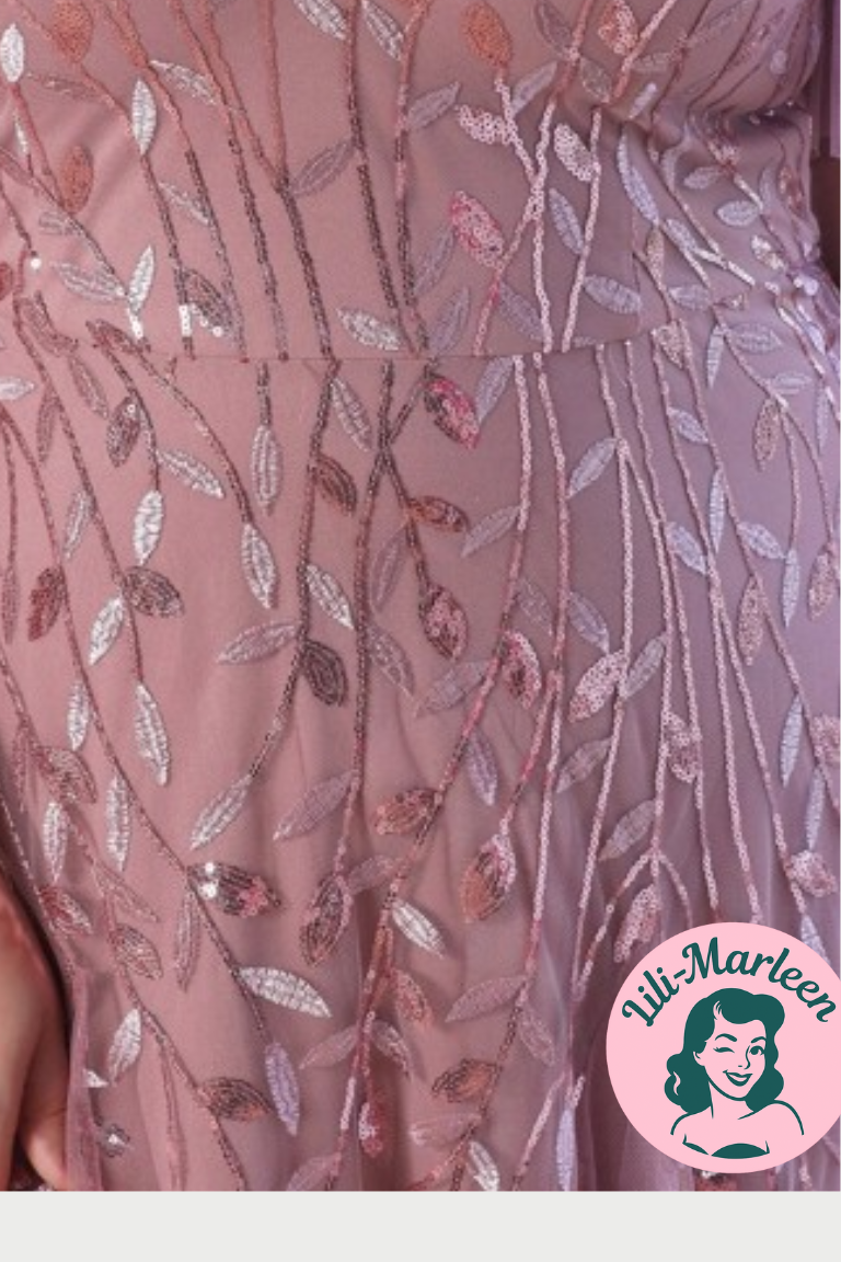 Lang gallakjole – Evita, gammelrosa – Smuk festkjole med sølvblade og pailletter