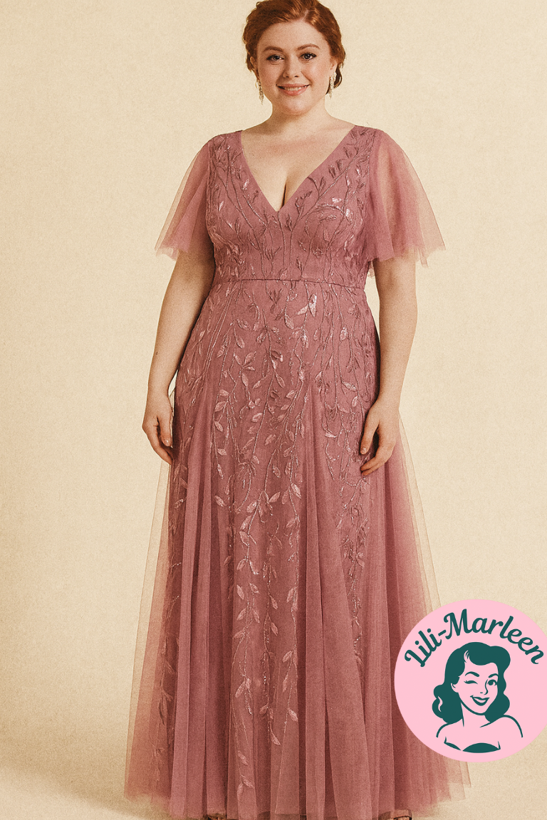 Oplev romantik og elegance med Evita-kjolen i en smuk gammelrosa farve. Denne lange gallakjole er dekoreret med delikate broderede sølvblade og glitrende pailletter, der skaber et drømmende og sofistikeret look. Med sine elegante sommerfugleærmer og et luftigt chiffonlag med blød underkjole er denne kjole ideel til formelle fester, gallabegivenheder eller som en unik festkjole. Kjolens v-udskæring fremhæver din feminine side og tilføjer en diskret elegance.