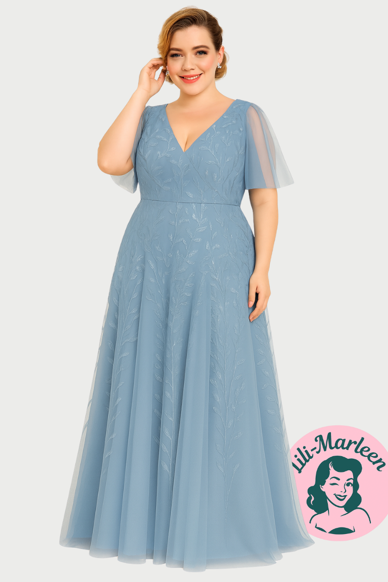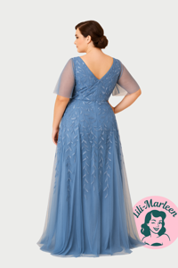 Oplev elegance og femininitet med Evita-kjolen i en betagende støvet blå. Denne lange og smukke gallakjole er dekoreret med delikate broderede sølvblade og glitrende pailletter, der giver et unikt og drømmende look. De elegante sommerfugleærmer og det luftige chiffonlag med en blød underkjole gør kjolen perfekt til formelle fester eller gallabegivenheder. Kjolens v-udskæring fremhæver din feminine side på en diskret og sofistikeret måde.