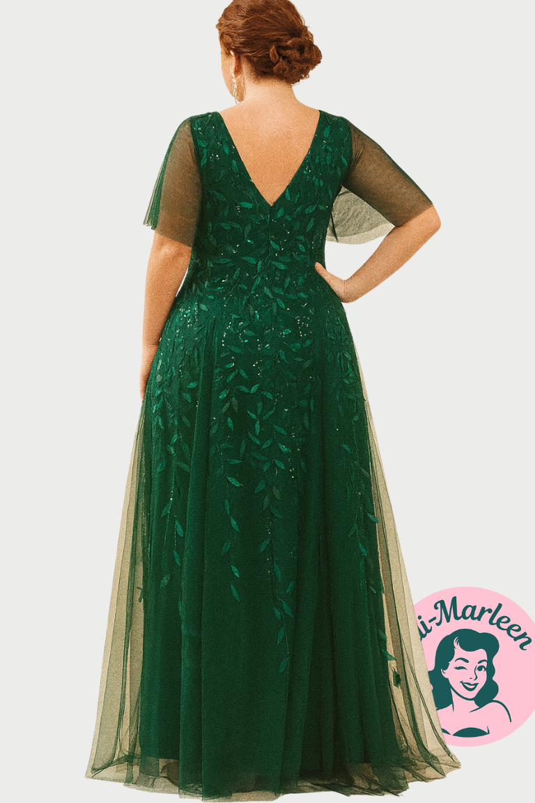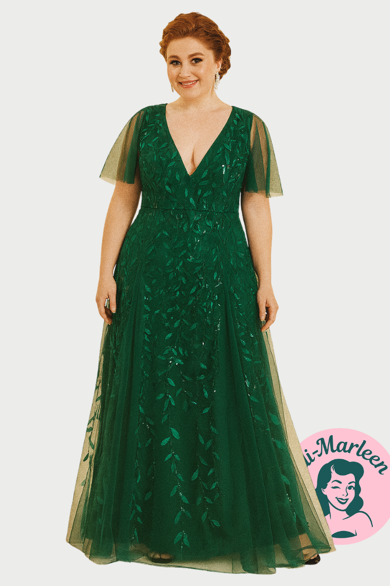 Lang gallakjole – Evita, Grøn – Smuk festkjole med blade og pailletter