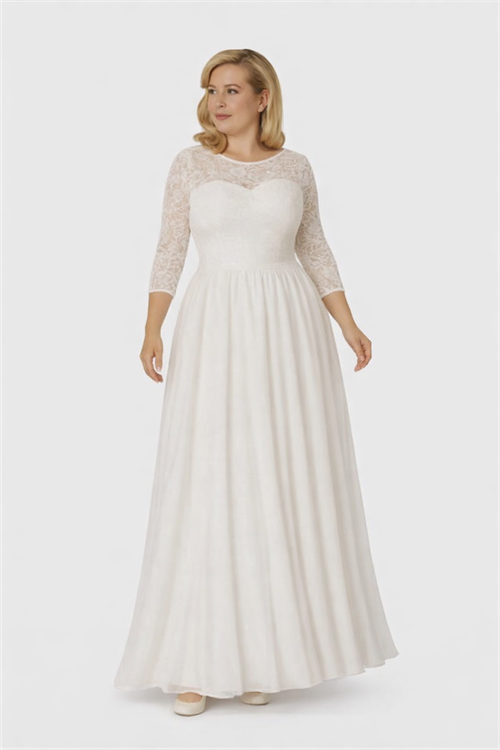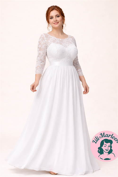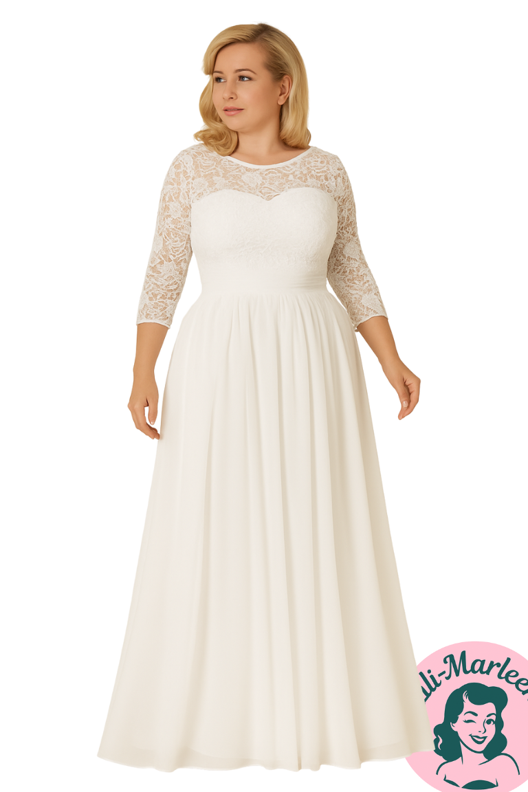 Tilføj elegance og skønhed til din garderobe med Ida Anette-kjolen, en lang, smuk hvid gallakjole med blondeærmer og chiffonsskørt. Denne kjole er perfekt til festlige lejligheder og særligt velegnet til alle størrelser – ideel som brudekjole til dig, som ønsker en enkelt og klassisk model