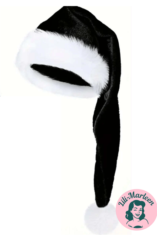 Denne nissehue er ikke bare julepynt. Det er en stemning. En lang, blød, næsten teatralsk nussehue i sort med hvid pelskant og dusk, der falder tungt og selvsikkert ned langs siden. Klassisk jul – men med kant og elegance. Perfekt til dig, der gerne vil være julet uden at ligne en børneillustration.