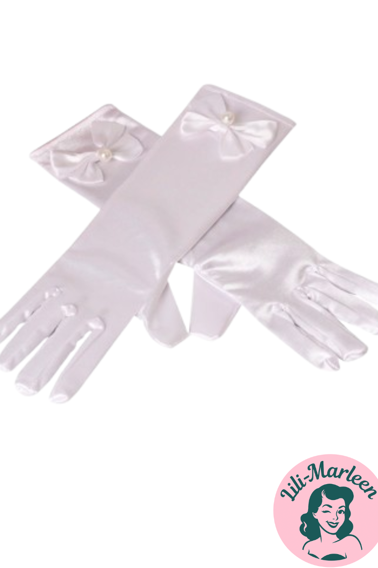 Lange satin festhandsker til børn - søde med sløjfe og lille perle - vi elsker fest og farver! De sødeste satinhandsker til børn, der ligner noget fra et eventyr! Disse handsker vil få dig til at tænke på Snehvide og vil give din prinsesse følelsen af at være midt i et eventyr.