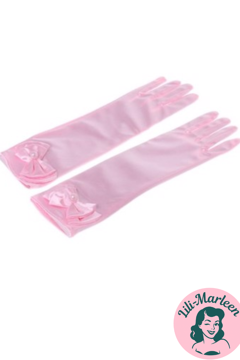 Lange satin festhandsker til børn - søde med sløjfe og lille perle - vi elsker fest og farver! De sødeste satinhandsker til børn, der ligner noget fra et eventyr! Disse handsker vil få dig til at tænke på Tornerose og vil give din prinsesse følelsen af at være midt i et eventyr.