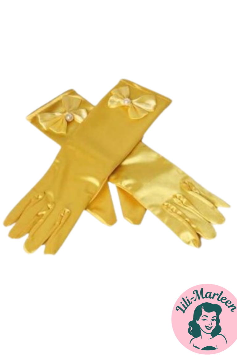 Lange satin festhandsker til børn - søde med sløjfe og lille perle - vi elsker fest og farver! De sødeste satinhandsker til børn, der ligner noget fra et eventyr! Disse handsker vil få dig til at tænke på Belle fra Skønheden & Udyret og vil give din prinsesse følelsen af at være midt i et eventyr.