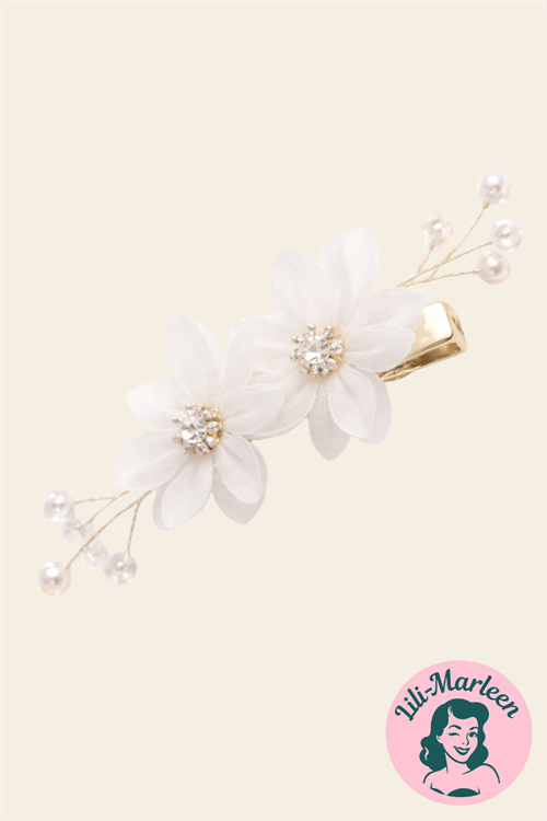 Lille Hårklips i Hvid med Blomster, Perler og Gulddetaljer – Fin og Feminint Udtryk: Denne lille hårklips er det diskrete, elegante valg, når håret skal have et let og romantisk løft. De hvide, transparente blomster kombineres med små perler, klare rhinsten og fine gulddetaljer. Resultatet er en let hårpynt, der understøtter frisuren uden at dominere – perfekt til både hverdag og fest.
