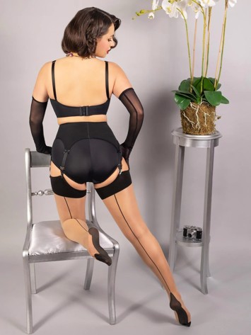 Vil du have det mest klassiske look af dem alle? Disse luksus strømper i champagne med dybsort søm og bred sort top skaber et dramatisk og elegant udtryk – inspireret af 1940’ernes og 50’ernes æstetik.