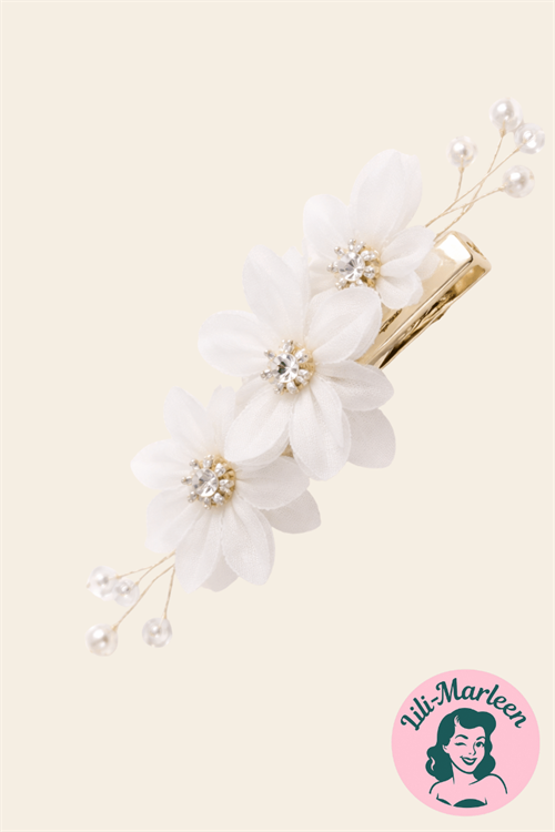 Mellem Hårklips i Hvid med Blomster, Perler og Gulddetaljer – Elegant Balance: Denne hårklips i mellem størrelse rammer balancen mellem det diskrete og det markante. De hvide, let transparente blomster kombineret med perler, klare rhinsten og fine gulddetaljer giver et feminint, let og eksklusivt udtryk, der løfter frisuren uden at tage over.