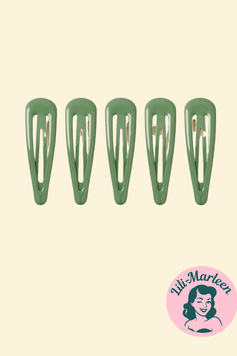 Mini trykhårspænder - glans - støvet grøn - 5 stk.Disse skinnende hårspænder er ikke kun dekorative, men også utroligt effektive til at holde dit hår på plads! Uanset om det er til hverdag eller fest, vil disse skønne spænder være det perfekte tilbehør til at fuldende din stil og tilføje et farverigt pust til din frisure.