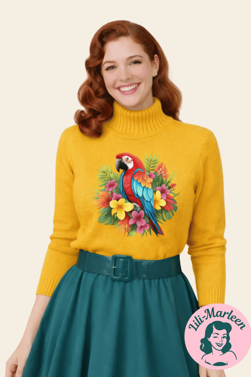 Der er intet neutralt over Miss Ara. Den solgule strik lyser op med sit farverige papegøjemotiv og rammer lige ned i dit vintagehjerte. En sweater med humor, personlighed og kant – til dig, der nægter at være baggrund.