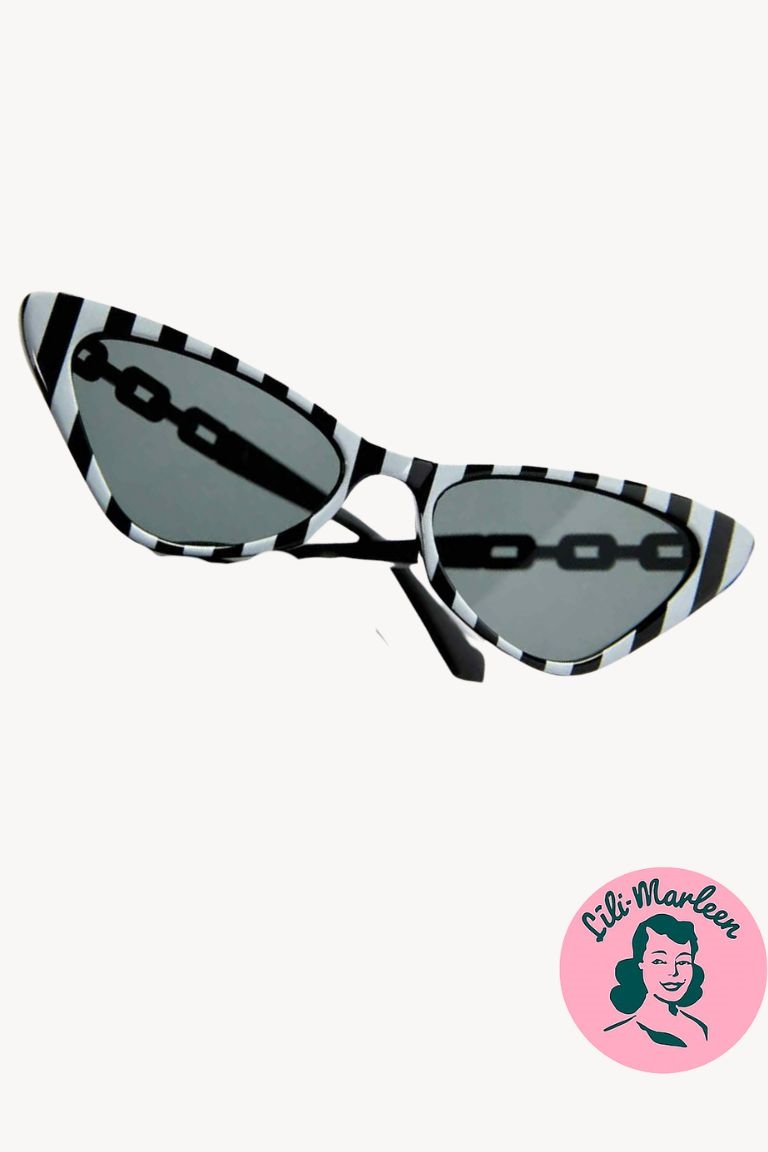 Miss Beetlejuice er ikke for sarte sjæle. Disse stribede cat eye-solbriller kombinerer 50’er-glamour med punket power og en snert af Tim Burton-stemning. Med deres sorte og hvide striber og spidse form får du et look, der både flirter med retro og stikker ud fra mængden – på den helt rigtige måde.