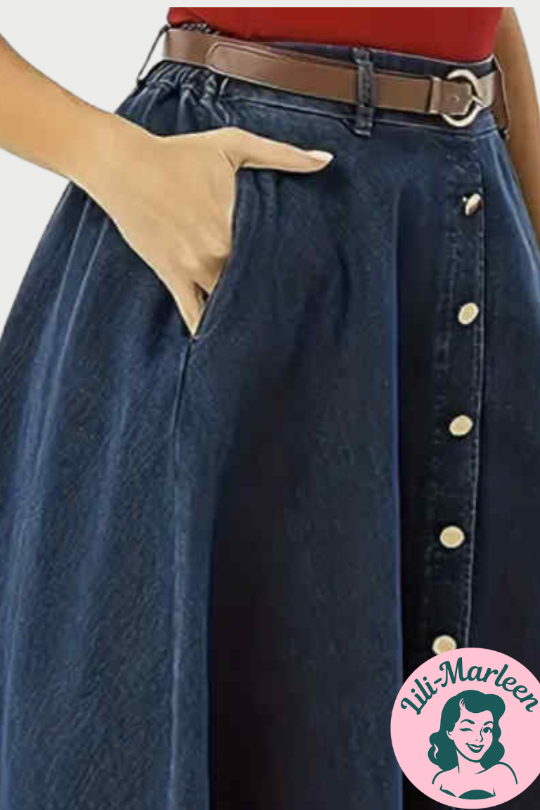 Miss Betty er en klassisk swingnederdel i blødt men kraftigt denim – perfekt til efterår og vinter. Nederdelen har et flatterende A-snit, frontknapper og bred linning, der fremhæver taljen på smukkeste vis. Den er nem at style både til hverdag og fest og giver et autentisk retro-look, som aldrig går af mode.