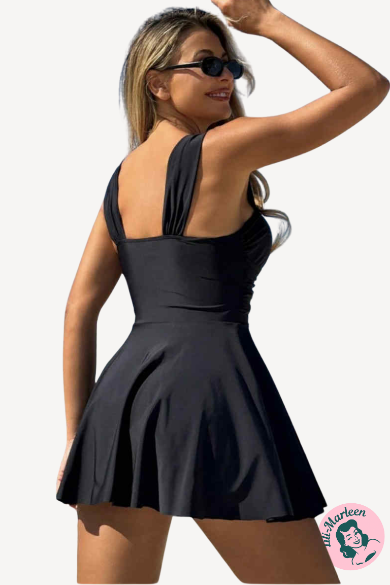 Leder du efter badetøj med både stil, støtte og selvsikkerhed? Så er Miss Black Dahlia svaret. Denne to-delte tankini kombinerer feminin elegance med komfort – og ligner ved første blik en kjole, men gemmer på et par praktiske badeshorts under den svungne skørt-overdel. En drøm for dig, der vil være dækket – uden at gå på kompromis med stilen!