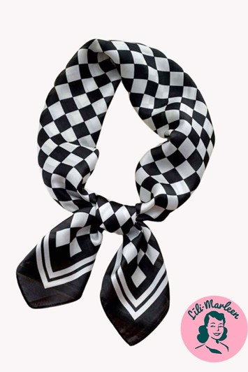 Miss Checkmate – Sort/Hvidt Silketørklæde med Skaktern/Racer-tern
