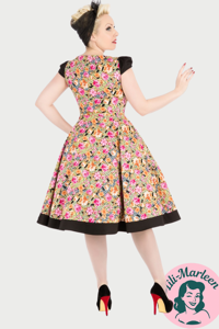 Miss Daisy er ren sommerglæde i kjoleform – en farverig swingkjole, der kombinerer et klassisk 50’er-snit med et frisk blomsterprint. Kjolen har sort kant forneden, der skaber kontrast og giver et elegant retro-touch. Den sidder flatterende ind til taljen og folder sig ud i et smukt skørt, der giver den perfekte vintage-silhuet. En kjole, der passer lige så godt til hverdagsglam som til festlige lejligheder.