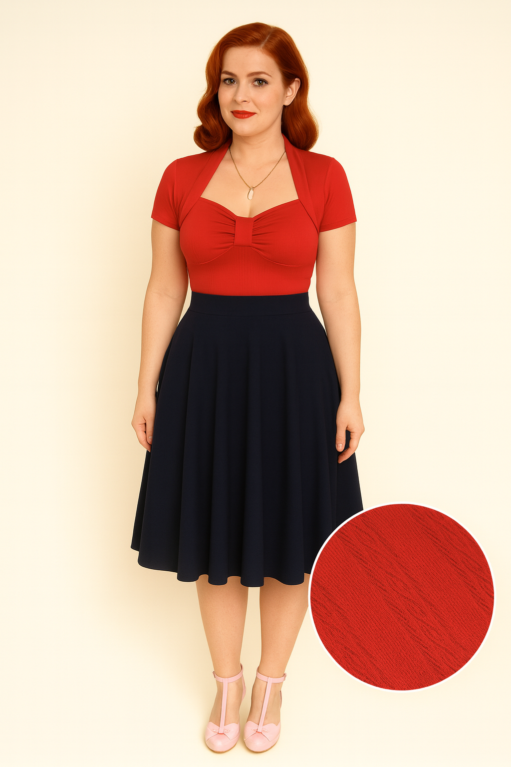 Fang blikke og fremhæv din figur med Miss Dolly – en feminin, tætsiddende top i en forførende rød nuance. Med indbygget bolero-effekt og let strikket mønster får du et vintage-inspireret look, der både er elegant og lidt frækt. Perfekt til højtaljede jeans, pencilskirts eller en svingende 50’er-nederdel.