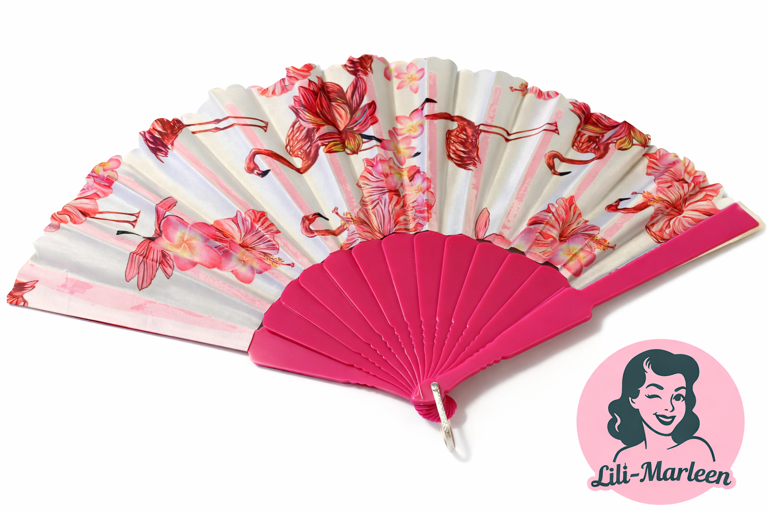 Denne smukke vifte kombinerer klassisk elegance med et legende, tropisk udtryk. De fine flamingoer og blomsterdetaljer giver et eksklusivt vintage look, mens de stærke pink nuancer tilføjer personlighed og power til dit outfit.