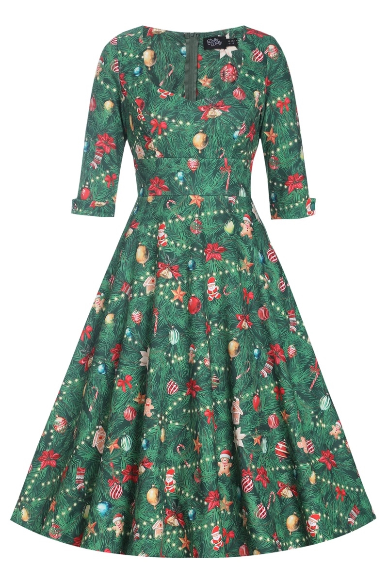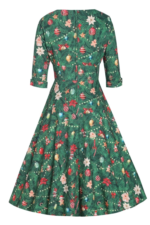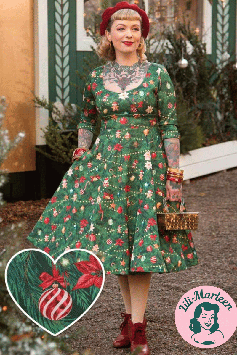 Miss Green Holly – En Magisk Julekjole i Dybt Gran-Grøn med Klassisk Vintagecharme: Miss Green Holly er julekjolen, der rammer den rigtige balance mellem legende nostalgi og elegant 50’er-silhuet. Den dybe grønne bund med juletræsmotiv skaber en levende, varm stemning – fyldt med julekugler, småkager, kristtjørn, stjerner og alt det, der gør december både hyggelig og smuk.