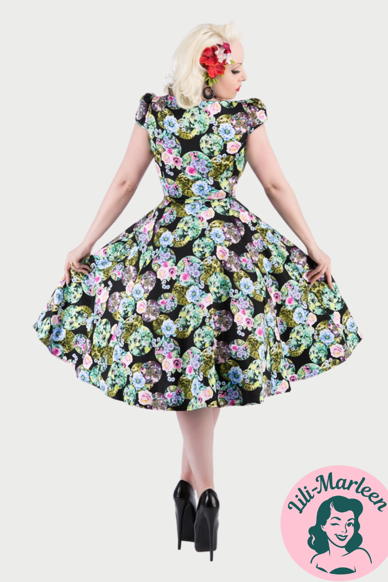 Miss Ivy er en ægte showstopper – en kjole der kombinerer klassisk sort med et farverigt blomsterhav. Den unikke halvmåne-udskæring i halsudskæringen og de fine mesh-detaljer i siderne giver et elegant kig til kavalergangen, mens cap-ærmerne understreger kjolens feminine retro-look. En perfekt kjole til dig, der vil føle dig både glamourøs og komfortabel til enhver festlig lejlighed.