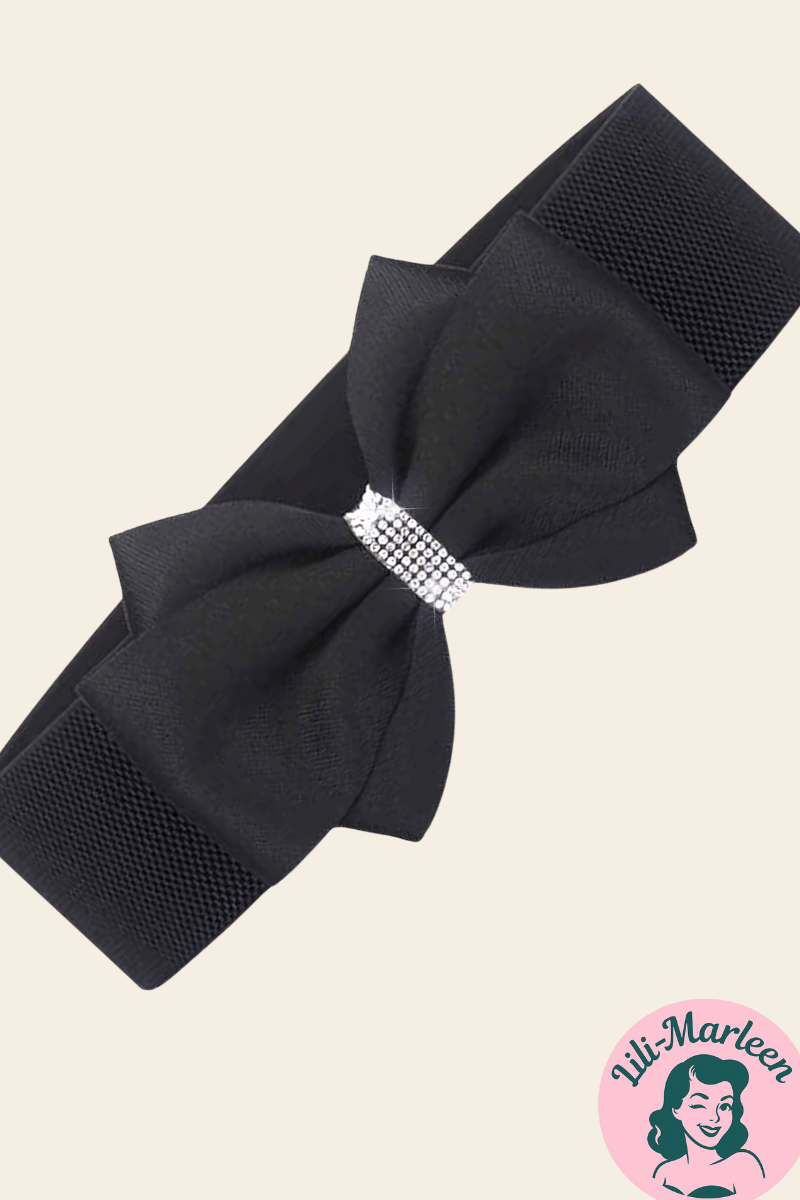 Sæt prikken over i’et på dit vintage-outfit med dette smukke elastikbælte i klassisk sort med stor sløjfe og funklende rhinsten-detalje. "Miss Ruby" er både elegant og festlig – perfekt til at fremhæve taljen i en swing-kjole, julekjole eller high waist-nederdel. Et must-have til retroelskere, pinup-stil og julet glamour!